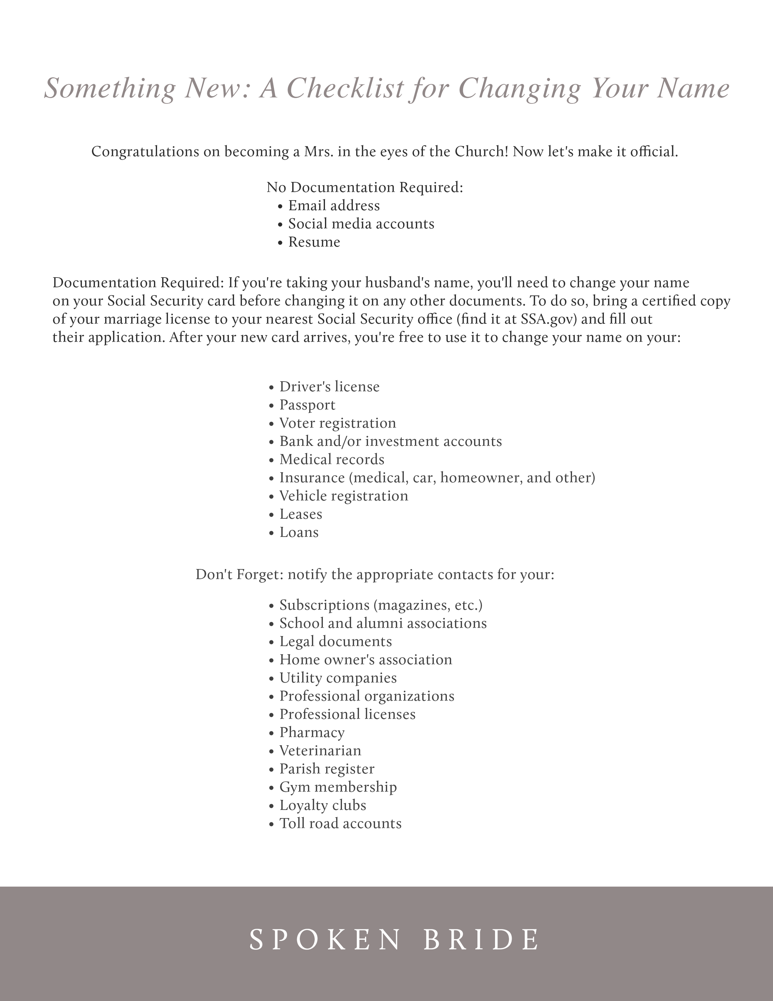 To help you simplify the process, we've put together a printable checklist for changing your name. Download yours by clicking here.